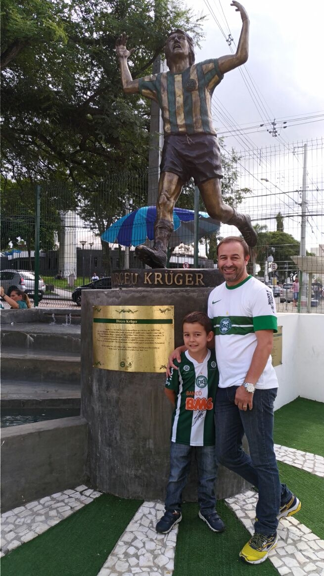 “O pai Jobert e o filho Lucca são parceiros. E amam futebol”. Começamos assim o texto do Torcedor Mirim de segunda (27). Mas a foto era a errada. Essa é a foto certa, do Jobert e do Lucca, coxas-brancas e que mandaram essa foto junto à estátua do Dirceu Krüger, lá no Couto Pereira. Pedimos desculpas aos dois, e claro que registramos a dupla agora da forma correta!
