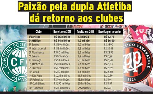O torcedor da dupla Atletiba é o que mais traz dinheiro para seus clubes. Pelo menos é o que atesta um levantamento da Pluri Consultoria. Segundo o estudo, o Coritiba é o time que mais arrecada junto ao seu torcedor. Em média, cada coxa-branca se dispõe a desembolsar por ano R$ 62,75 pela sua paixão clubística. É quase o dobro do segundo colocado, o Atlético, onde cada rubro-negro gasta R$ 36,60 por ano com o Furacão, seguido do santista, que embalado pelo fenômeno Neymar gasta R$ 35,90.