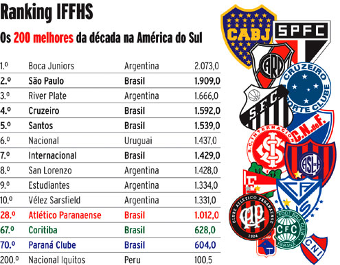 O Trio de Ferro representa com dignidade o futebol paranaense em um levantamento com os 200 melhores sul-americanos da década. O ranking, organizado pela Federação Internacional de História e Estatística do Futebol (IFFHS), é liderado pelo Boca Juniors da Argentina.