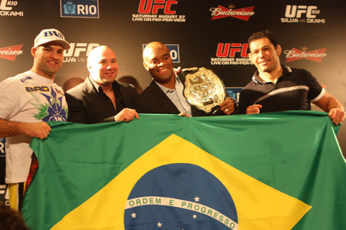 Na coletiva de imprensa, o presidente do UFC, Dana White, exaltou o público brasileiro. “Estou há 10 anos organizando eventos ao redor do mundo, e, sem dúvidas, o Brasil tem a torcida mais barulhenta”, disse. “Com certeza voltaremos”, completou. Mas quem mais chamou a atenção durante a coletiva foi Forrest Griffin, o único derrotado que deu as caras na sala de imprensa. Marcado pela torcida por ter criticado o Brasil e declarado que não gostaria de ter saído dos Estados Unidos para lutar, Griffin, demonstrou muito bom humor ao dizer que não usaria isso com desculpa, “embora adoraria ter um desculpa” e arrancou gargalhadas ao interromper a pergunta para Anderson Silva sobre quem seria o próximo adversário do campão dos médios. “O próximo desafio para ele é enfrentar dois caras ao mesmo tempo”, brincou. Anderson, mostrando sua autoconfiança repetiu que seu sonho era lutar com seu clone.