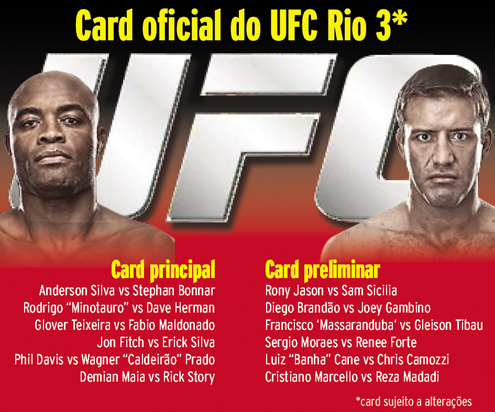 Um pouco mais “gordo”, Anderson Silva coloca sua invencibilidade no UFC à prova diante do americano Stephan Bonnar. Para salvar o UFC Rio 3, o brasileiro teve que subir de categoria, por isso vai entrar no octógono hoje à noite com 91,6kg, bem acima dos tradicionais 84kg da categoria peso médio, na qual é campeão absoluto. O combate terá transmissão ao vivo da Globo, a partir das 00h40.