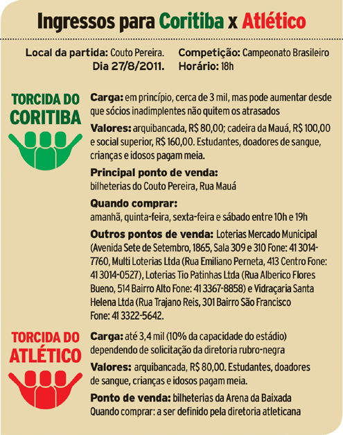 O confronto será às 18h de sábado no Alto da Glória e a expectativa é de casa cheia. Com 28 mil sócios com possibilidade de conferir de perto a última rodada do primeiro turno do Brasileiro, serão apenas cerca de três mil entradas para a torcida alviverde e os regulamentares 10% (3,4 mil) para a galera do Atlético, dependendo de pedido a ser feito.