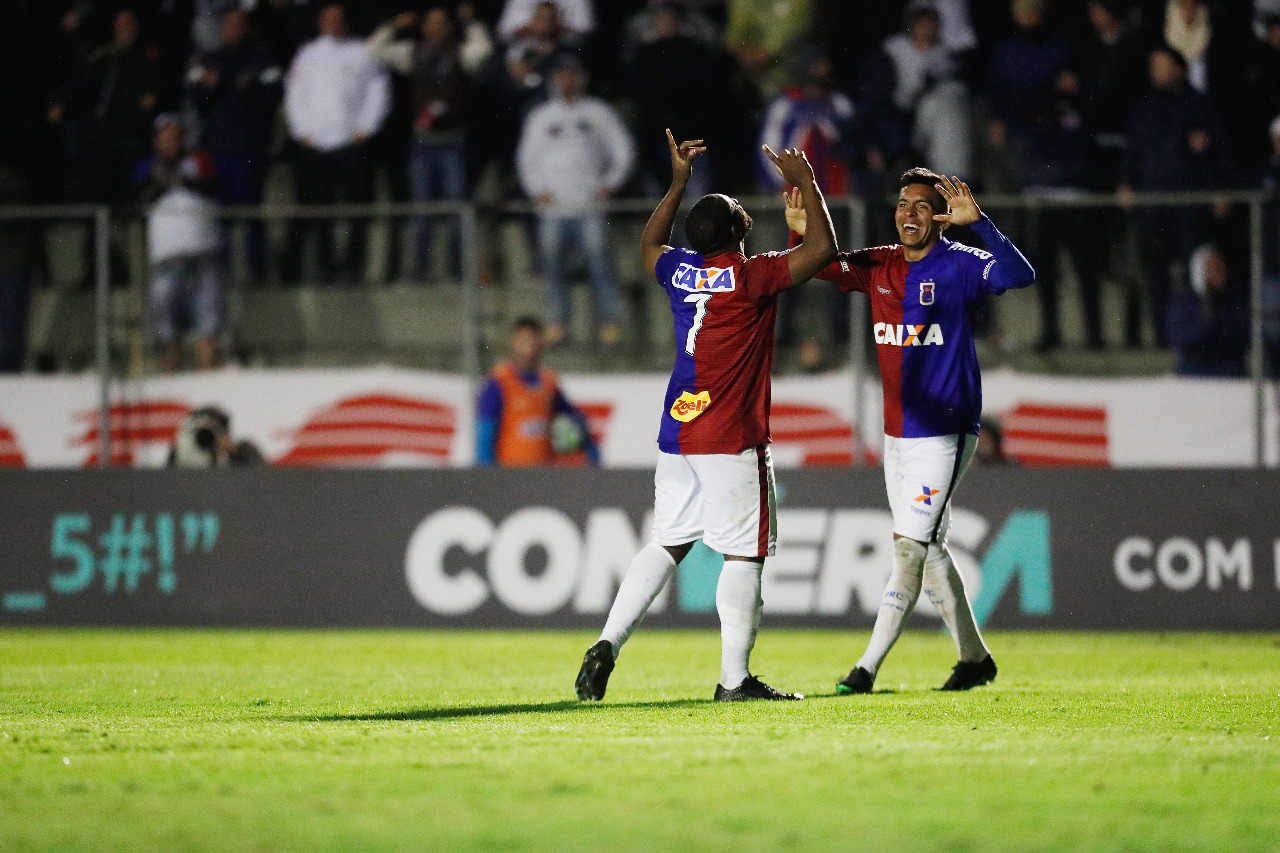 Léo Itaperuna comemora como Thiago Santos, o autor do gol. Enfim, o Paraná Clube venceu. Foto: Jonathan Campos