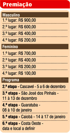As oito melhores duplas ranqueadas devem confirmar participação no torneio principal na Federação de Voleibol até o dia de amanhã. A premiação para a Etapa de Cascavel terá troféus aos três primeiros colocados e premiação em dinheiro de 3.500,00 reais.