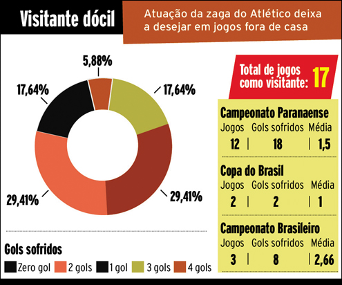 Não é de hoje que a defesa atleticana não inspira confiança. Em toda a temporada, contando também o Campeonato Paranaense, quando esteve em campo o time sub-23, o Rubro-Negro, na condição de visitante, não tomou gols somente em três partidas. Foram duas pelo Estadual (1 x 0 contra Paranavaí e 1 x 0 contra o J. Malucelli) e uma pela Copa do Brasil (1 x 0 no Brasil de Pelotas).