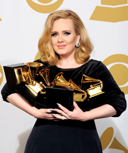 A cantora britânica Adele fez um verdadeiro “arrastão” na festa de entrega do 54º Grammy Awards, neste domingo (12), em Los Angeles, nos Estados Unidos. A cantora faturou nada menos que seis troféus. Ela superou apenas o Foo Figthers, do ex-baterista do Nirvana, Dave Ghrol, que ganhou em cinco categorias.