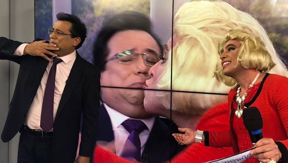 O apresentador Geraldo Luís “não resistiu” aos encantos do ator Marcos Souza, que interpreta o Garçom Maluco no quadro A Hora da Venenosa. Vestido de Hebe Camargo, o artista tentou beijar o apresentador, que a princípio resistiu, mas depois acabou dando um beijo do estilo “selinho” que consagrou a apresentadora brasileira, que recentemente foi homenageada em um filme. Saiba mais sobre a produção.