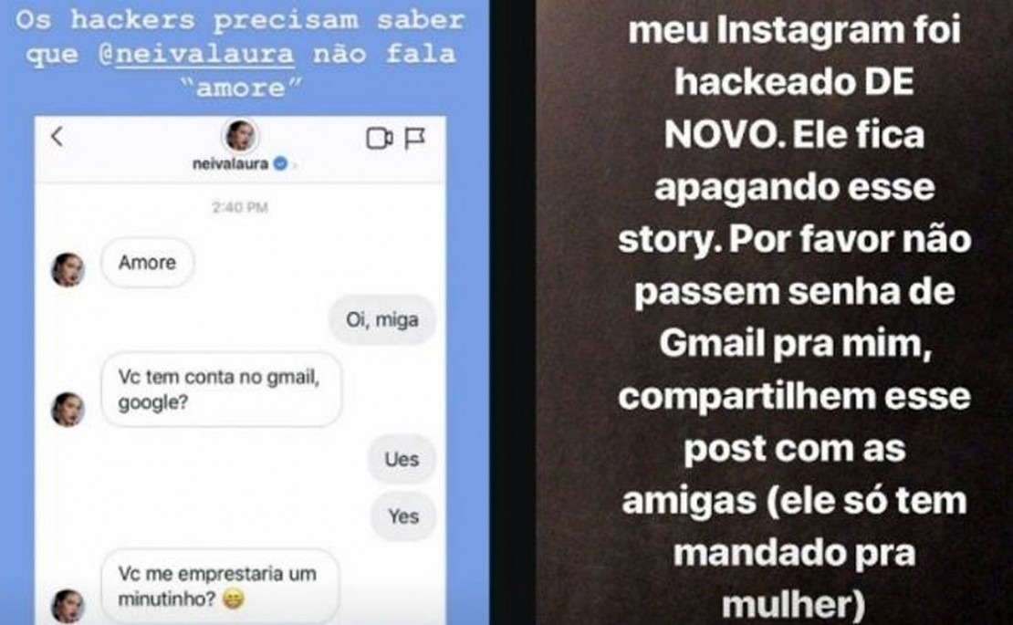 “Os hackers precisam saber que Laura Neiva não fala ‘amore'”, disse a amiga. Laura ainda publicou um recado aos amigos e fãs. “Meu Instagram foi hackeado de novo. Ele fica apagando esse Story. Por favor, não passem senha de Gmail para mim. Compartilhem esse post com as amigas. Ele [hacker] só tem mandado para mulher”, alertou a atriz.