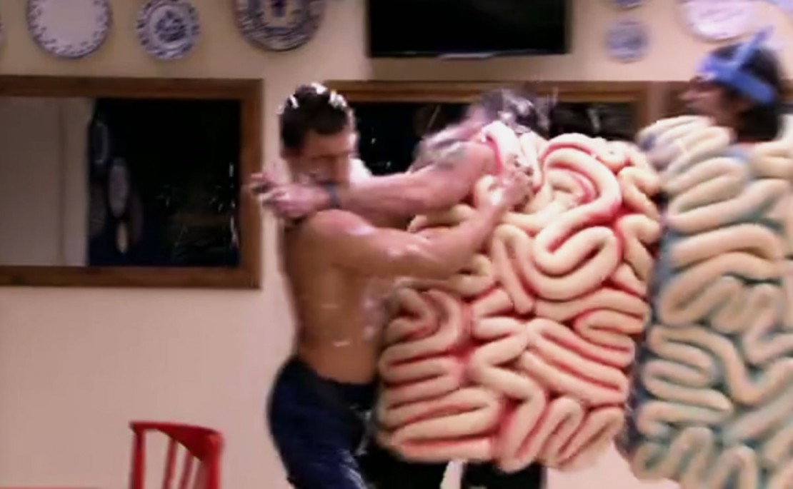 Manoel chegou correndo e esguichou espuma em Marcos, que virou de repente e bateu no colega de casa com o braço. Marcos disse na hora que havia sido uma agressão e os dois continuaram discutindo e trocando xingamentos.