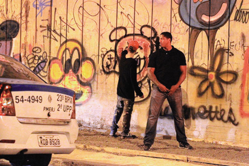 Justin Bieber está tentando aproveitar ao máximo sua estadia no Brasil. O cantor canadense de 19 anos foi fotografado grafitando em São Conrado, no Rio, protegido por um segurança na madrugada de ontem.