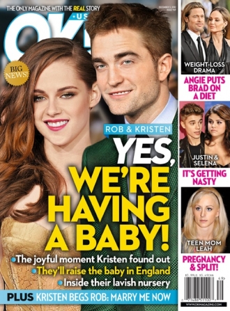 Robert Pattinson e Kristen Stewart, os protagonistas da saga “Crepúsculo”, estão esperando seu primeiro filho, segundo a revista americana “Ok”. Kristen Stewart e Robert Pattinson passaram três meses separados após a atriz ser flagrada traindo Pattinson com o diretor Rupert Sanders. O casal retomou o relacionamento recentemente e tem viajado pelo mundo para divulgar último filme da saga “Crepúsculo”, “Amanhecer – Parte 2”.