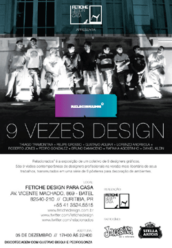 A Fetiche Design para Casa apresenta a exposição de pôsteres criados por nove designers atuantes em Curitiba. Cada um dos integrantes do coletivo “Relacionados” adotou diferentes temas e propostas, que vão do futebol à psicanálise, passando por relatos visuais de viagens – reais e imaginárias – e releituras livres de cartas de baralho.