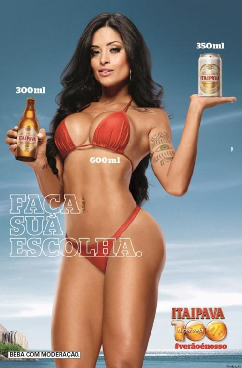 Em uma das propagandas, Aline Riscado, que é chamada de “Verão” nas demais peças publicitárias da mesma marca de cerveja, aparece trajando um biquíni vermelho e segura uma cerveja logo abaixo do número “300 ml”. Na outra mão, ela mostra outra cerveja, perto da mensagem “350 ml”. Logo abaixo dos seios da modelo aparece inscrição “600 ml”. Um mensagem provoca: “Faça sua escolha”.