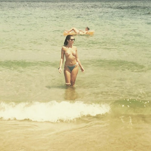 A gata aparece de topless em uma praia de Ibiza, na Espanha.