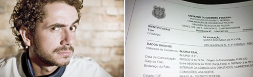 O repórter do CQC, da Band, Felipe Andreoli, levou um tapa na cara do deputado Marcio Reinaldo Moreira, (PP-MG) e registrou um Boletim de Ocorrência numa delegacia da Polícia Civil do Distrito Federal, anteontem à noite. De acordo com o humorista, o político o agrediu fisicamente e verbalmente. “Hoje, na Câmara dos Deputados, graças ao nobre Dep. Marcio Reinaldo Moreira, descobri o significado de “um tapa na cara da sociedade…’”, escreveu ele em seu Twitter.