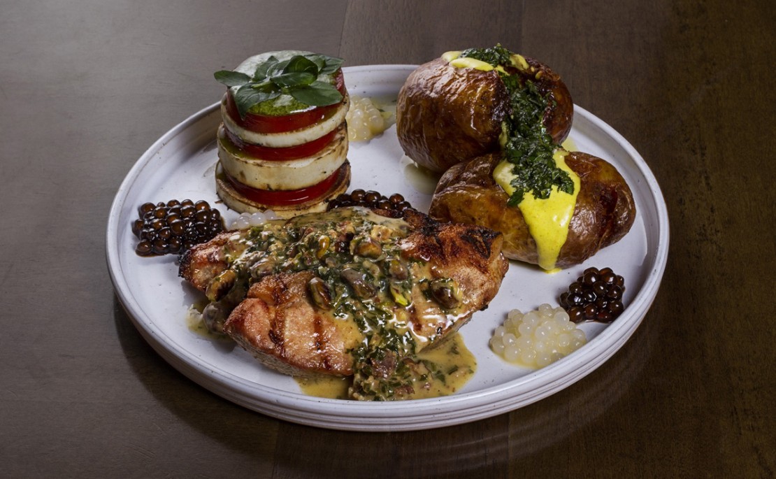 Descrição: Picanha suína grelhada coberta com molho de pistache, acompanhadas de batatas rústicas ao creme de Aji, salsa verde e sagu de balsâmico e laranja, caprese de palmito tostado e pesto de rúcula