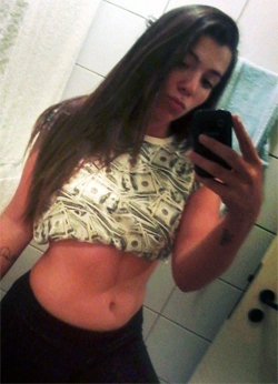 A morena exibiu as curvas e a barriga sarada, conquistada por conta de muita malhação, no Instagram. Ela aparece com uma sugestiva camiseta estampada com dinheiro americano. “Dollarzzz. #cortotudo”, disse a moça.