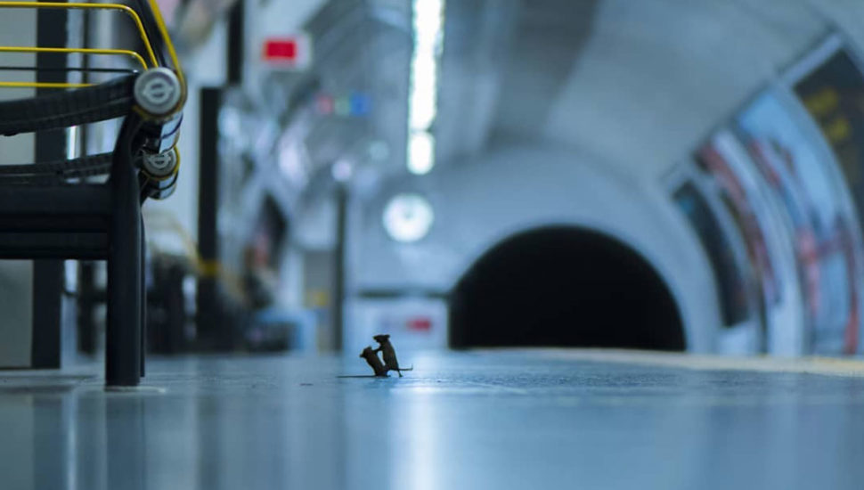 “Os ratos estavam lutando por um algumas migalhas. O embate durou apenas um segundo antes de um deles fugir com a migalha, triunfante”, contou Rowley. O registro foi feito em uma estação de metrô de Londres, uma das muitas visitadas pelo fotógrafo, sempre durante a noite.