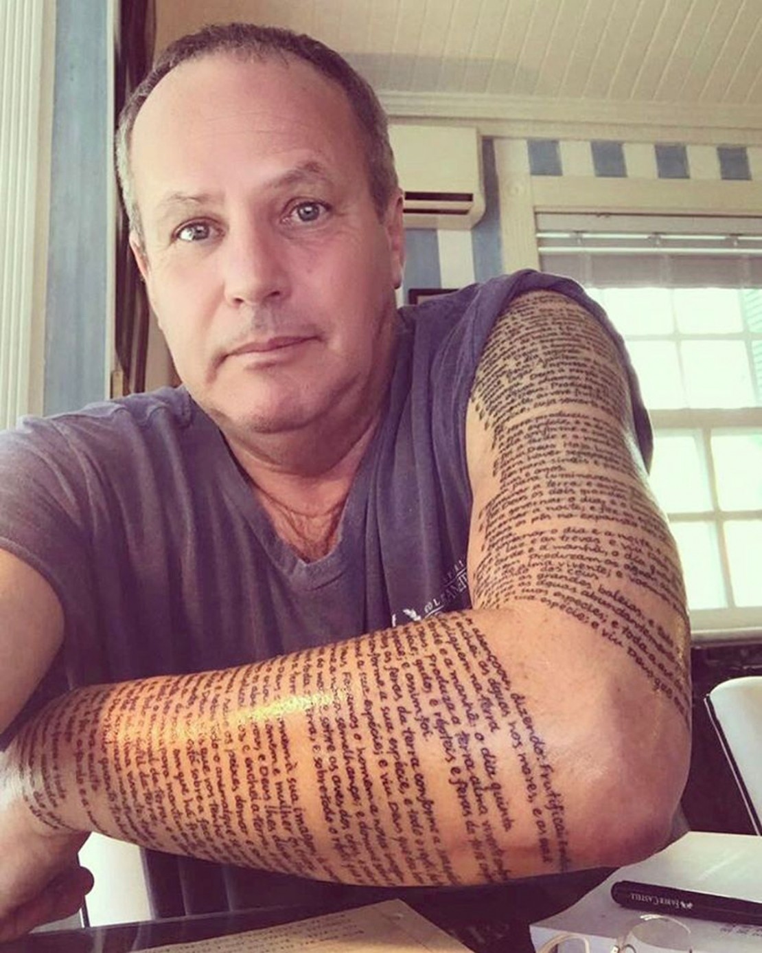 O diretor de TV e cinema Jayme Monjardim apareceu com o braço esquerdo totalmente tatuado no último domingo, dia 15. Ele escreveu trechos bíblicos em todo o membro e mostrou o resultado numa publicação do Instagram.