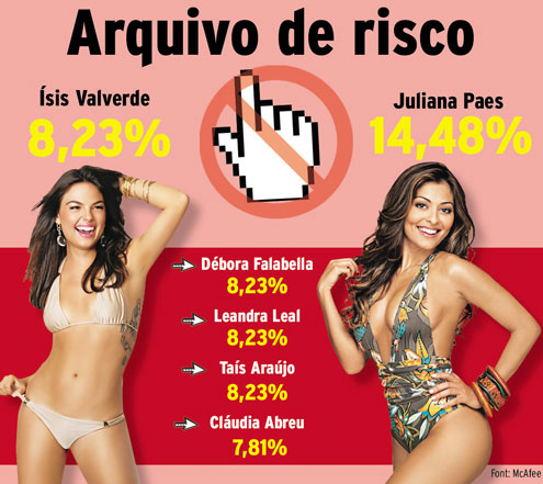 De acordo com a empresa, os criminosos se aproveitam das figuras mais populares e em evidência no momento para criar sites falsos com malwares. Aqueles que pesquisam o nome da celebridade junto com os termos “downloads gratuitos” ou “fotos nuas”, correm mais riscos de entrar num site com arquivos infectados. Em segundo lugar na lista está Débora Falabella, a Nina da novela Avenida Brasil.
