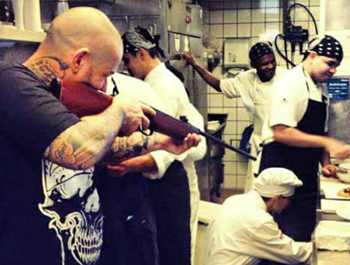 Na imagem, o chef aparece apontando uma arma para os funcionários do seu restaurante.