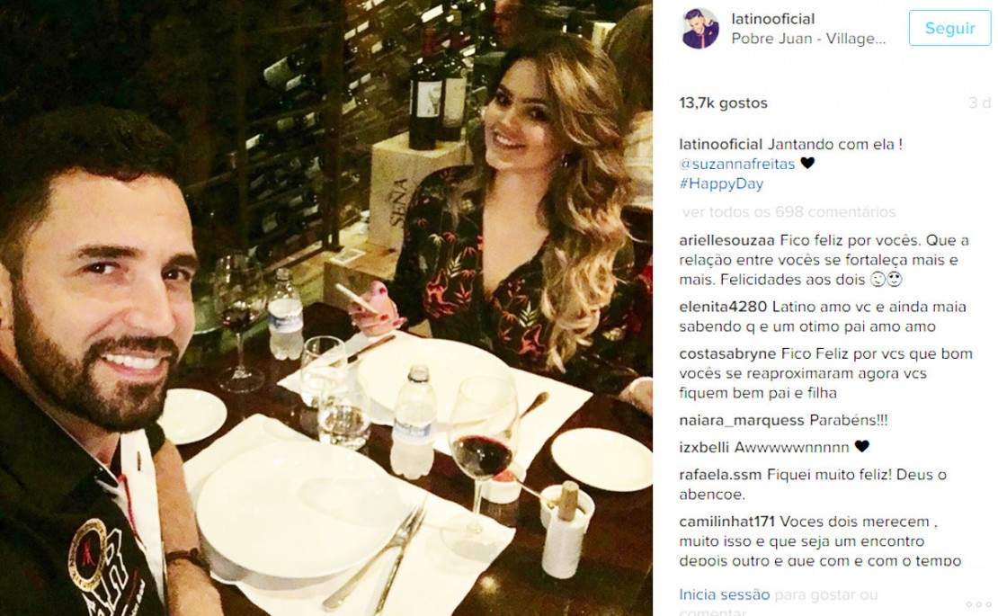 Uma foto de pai e filha deixou muitos seguidores felizes. Latino postou uma imagem no Instagram jantando com Suzanna Freitas, sua filha com Kelly Key, e os fãs comemoraram a reconciliação.