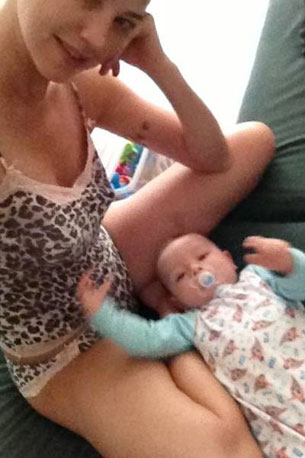 Na foto, a gata aparece com o pequeno Dom, seu filho, entre as pernas.