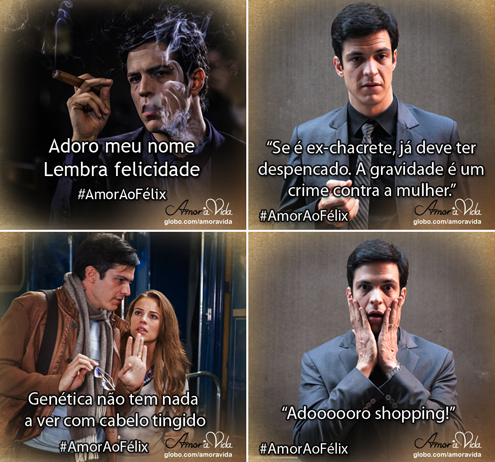Félix (Mateus Solano) já rouba a cena em Amor à vida. As frases do vilão homossexual têm sido bastante comentadas nas redes sociais e já rendem comparação com Carminha (Adriana Esteves), a malvada de outra novela das 21h da Globo, Avenida Brasil. Entre as mais lembradas estão “tintura de cabelo não tem nada a ver com genética” e a expressão “meu doce”, que ele usa para chamar qualquer pessoa, mas para o ator as comparações não procedem.