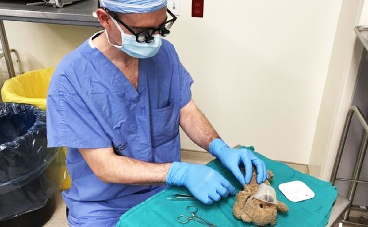 O neurocirurgião canadense foi performático para atender ao pedido da criança. Colocou luvas, vestiu roupas descartáveis e até instalou máscara de oxigênio no brinquedo. Ao fim do procedimento, o ursinho levou alguns pontos.