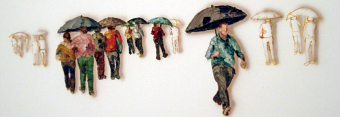 | Obras da série Diálogos visuais, da artista plástica Marilene Zanchet, que reflete sobre o anonimato nas grandes metrópoles. |