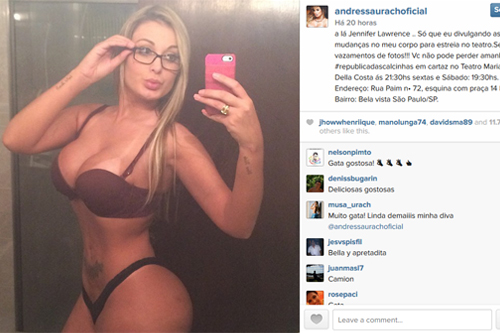 Na legenda da imagem, a ex-vice Miss Bumbum postou a seguinte mensagem.”À la Jennifer Lawrence. Só que eu divulgando as mudanças no meu corpo para estreia no teatro. Sem vazamentos de fotos!”, citando o recente escândalo de que fotos nuas da atriz norte-americana vazaram na Internet.