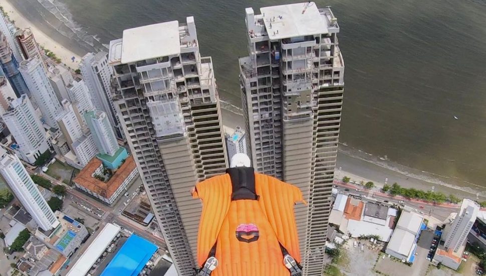Depois disso, foi a vez do “homem pássaro” Luigi Cani, especialista em saltos de paraquedas, base-jumpo e wingsuit. Ele já postou um vídeo em suas redes sociais com um aperitivo so que ele aprontou no Yachthouse. No salto, usando uma roupa especial que permite ao esportista “planar”, ele passou entre as duas “torres gêmeas” de Santa Catarina. Veja!