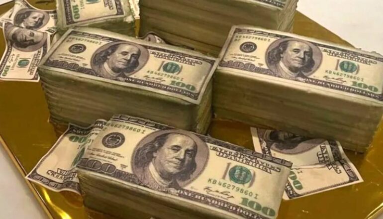 No vídeo, o pequeno aparece sorridente enquanto bate palmas em cima de um bolo com formato de várias notas de dólares. Veja: