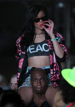 Uma das atuais musas da música pop, a cantora Rihanna, foi flagrada em um festival de música realizado na Califórnia, nos Estados Unidos, em uma atitude pra lá de suspeita. A artista apareceu em um show do rapper Snoop Dogg sentada nos ombros de um homem e fumando um cigarrinho pra lá de suspeito.