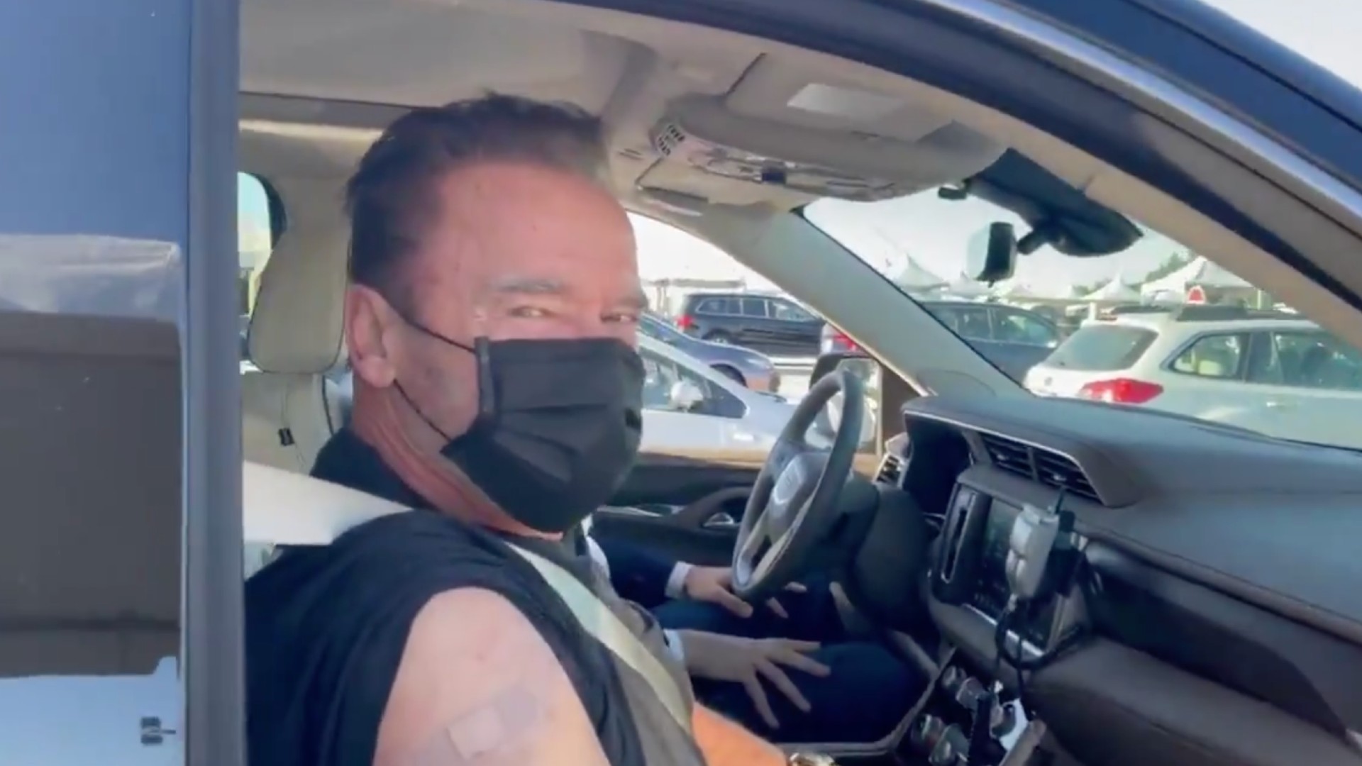 Sentado no banco do carona, Schwarzenegger pediu para a enfermeira “abaixar essa agulha!” enquanto ela o vacinava. Isso foi um trocadilho com uma fala do filme de comédia “Um Herói de Brinquedo” (1996), quando o ator, que interpretava Howard Langston pede para “abaixar esse cookie!”.