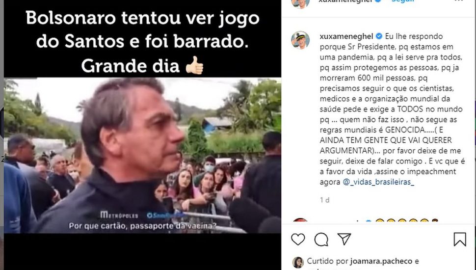 A apresentadora Xuxa, 58, está na bronca com o presidente Jair Bolsonaro (sem partido). Em vídeo reproduzido em suas redes sociais, ela repercutiu e respondeu ao presidente sobre o motivo de ele ter sido barrado no jogo do Santos no domingo (10).