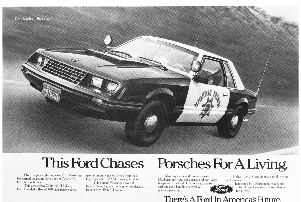 O Ford Mustang ingressou no serviço especial em 1982 e estrelou uma campanha publicitária que dizia: “Este Ford persegue Porsches para viver”. O anúncio destacava a sua capacidade em curvas e aceleração de zero a 80 km/h em 6,3 segundos, que permitia acompanhar outros carros esportivos da época.