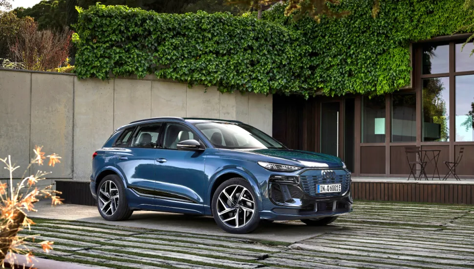 Externamente, o novo Audi Q6 e-tron assimila a nova linguagem visual minimalista da marca das quatro argolas, com linhas mais fluídas e orgânicas, vincos menos proeminentes e conjunto ótico afilado. Além disso, o modelo utiliza o novo logotipo Audi rings, com estética bidimensional e cores foscas. As inscrições em relação ao nome do veículo, versão e motorização estão tanto na tampa traseira do porta-malas quanto na coluna B, de forma discreta e elegante.