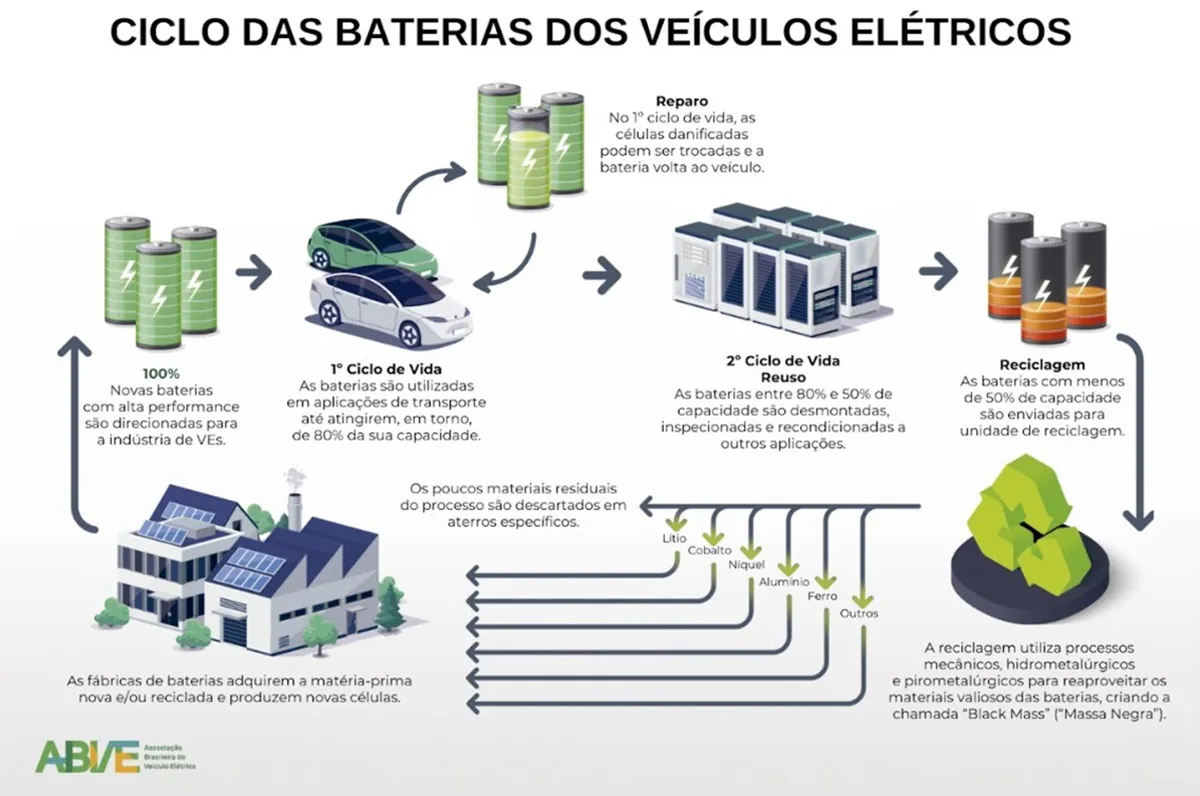 As baterias de lítio, que equipam a grande maioria dos veículos eletrificados (elétricos puros ou híbridos) rodando pelo mundo podem ser 100% recicladas, evitando qualquer risco ou prejuízo ao meio ambiente. A tecnologia para desenvolver este trabalho está difundida mundialmente e já é desenvolvida também no Brasil – as três principais empresas especializadas nessa atividade que operam no país são Re-Teck, Energy Source (associadas da ABVE) e Lorene.