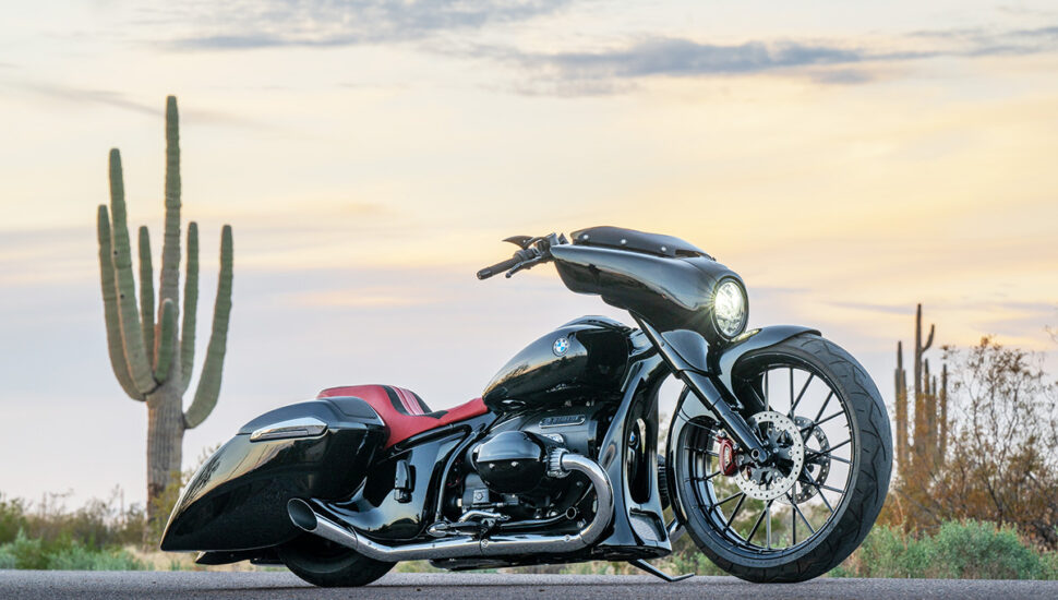 O visionário das motocicletas personalizadas, Paul Yaffe, superou as expectativas mais uma vez com o lançamento de sua mais recente obra-prima, uma personalização única da BMW R 18, batizada de One Eight “C”. Combinando a estética clássica da hot rod com a essência distintiva da BMW, este projeto é uma prova da excelência de Yaffe como designer. Para esse resultado, ele encomendou uma roda dianteira de 26” x 5,5”, cortada de um bloco sólido de alumínio, segurando um pneu dianteiro feito à mão com 180 mm de largura. O quadro teve de ser alongado e inclinado para acomodar a nova roda dianteira, enquanto estruturas especiais de suporte do garfo dianteiro precisaram ser projetadas para corrigir a medida da trilha e otimizar o manuseio. O paralama dianteiro de aço foi feito do zero. A carenagem original da R 18 foi cortada em vários pedaços e reestruturada para corrigir a posição do farol e fluir para a nova roda dianteira. Para cobrir o espaço entre a carenagem e o tanque de combustível, foi desenvolvido um defletor frontal exclusivo, que esconde estrategicamente o radiador. Veja o resultado na imagem.
