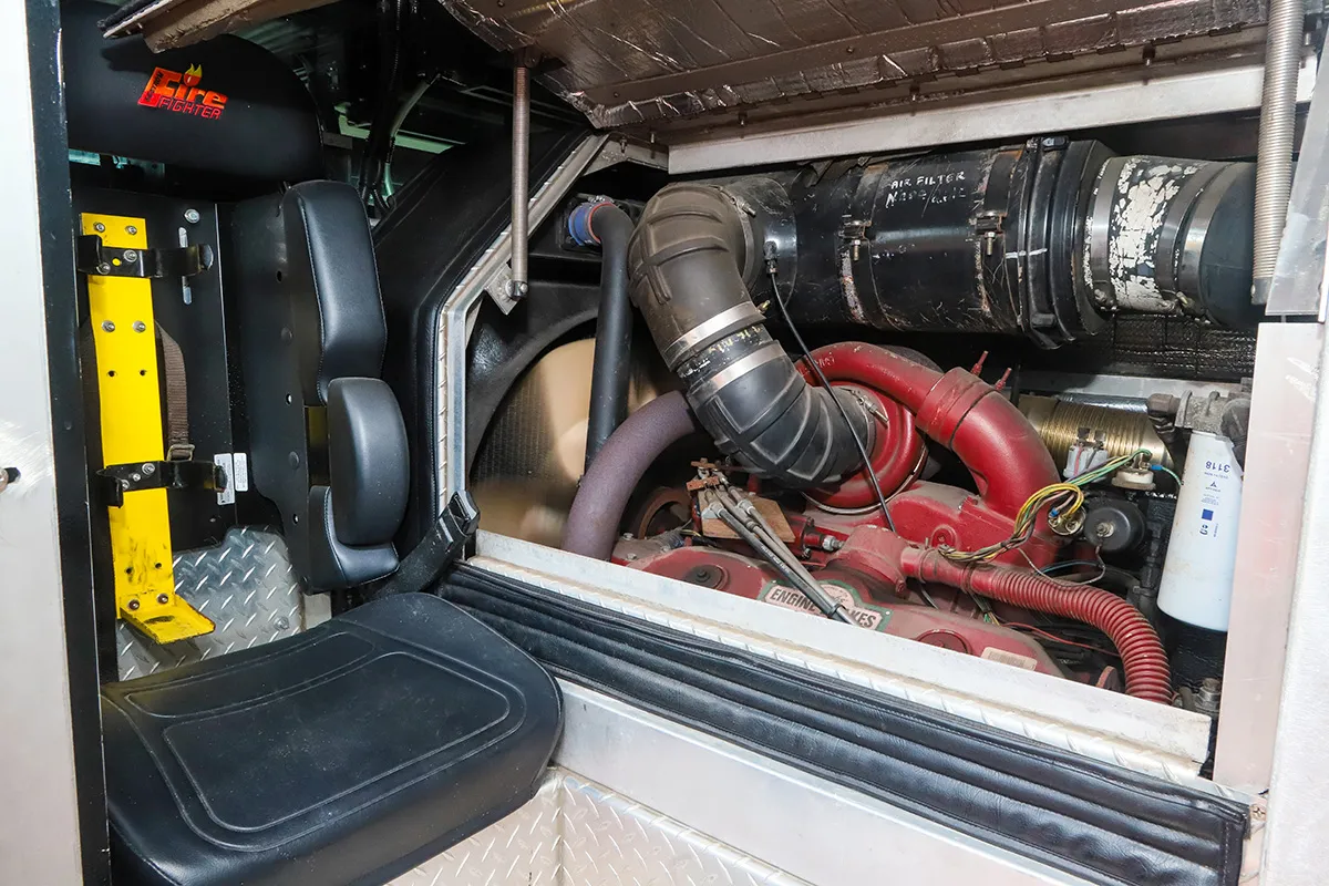Na hora de acelerar este gigante, entra em ação o V8 Detroit turbodiesel de 12,1 litros. Uma verdadeira usina de força que produz 475 cv de potência e 180 kgfm de torque. O motor é responsável não apenas por movimentar o veículo, mas também a bomba hidráulica da escada e a bomba d’água, disponibilizando duas saídas de força para conectar as bombas. O V8 está acoplado à transmissão automática Alisson com 5 velocidades à frente, mais a marcha à ré, contando com uma caixa de torque gigante que garante toda a força necessária para esticar a escada. A tração é feita por meio das 4 rodas traseiras.