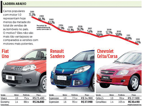 Ele tem preço mais acessível, é mais econômico na cidade e exatamente por isso está em maior número nas ruas. Mas, apesar desses atrativos, o carro popular 1.0 está deixando de ser a preferência do consumidor brasileiro. Em 2001, representava 71,1% das vendas de automóveis no Brasil, em 2010 caiu para 50,8% e em 2011 fechou em 46,8%, conforme dados da Anfavea – associação que reúne os fabricantes no Brasil.