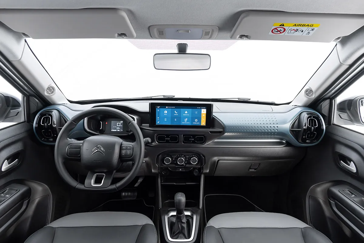 O interior acompanha as mudanças, com destaque para os bancos dotados de uma exclusiva forração premium. O material recebe costuras também em tom azul, cor que se repete nas bordas dos tapetes com o nome da versão. Por fim, soleiras metalizadas completam o pacote de estilo que diferenciam o novo C3 YOU.