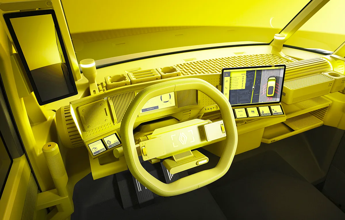 Formado por duas partes, o painel de bordo do Estafette Concept conta com um espaço tecnológico com visão totalmente desobstruída em torno do volante, com uma tela de 7’’ para o painel de instrumentos e uma grande tela de 12’’ deslocada para a direita, mas voltada para o condutor. Em sua base, no centro do volante e à esquerda, vários widgets servem de atalho para um acesso direto às funções escolhidas. O sistema multimídia de tecnologia aberta pode receber diferentes softwares relacionados ao trabalho dos usuários do veículo.