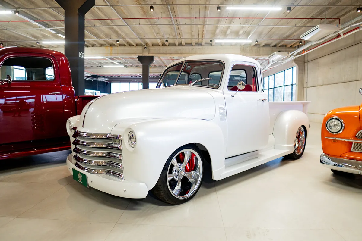 1 – Chevrolet 1951 branco perolizado: A famosa Chevrolet ‘‘boca de sapo’’ 1951 teve o powertrain original substituído pelo do Camaro, um V8 LS3 de 6.2 litros com 400 cv de potência acoplado ao câmbio automático de 6 marchas. Conta, ainda, com suspensão independente na dianteira e na traseira, freios Brembo, direção hidráulica, ar-condicionado e vidros elétricos. As rodas dianteiras são aro 18’’ e, as traseiras, aro 20’’, algo comum nos Estados Unidos. Em resumo: um legítimo projeto norte-americano realizado no Brasil pela Ogro’s Garage Restaurações;
