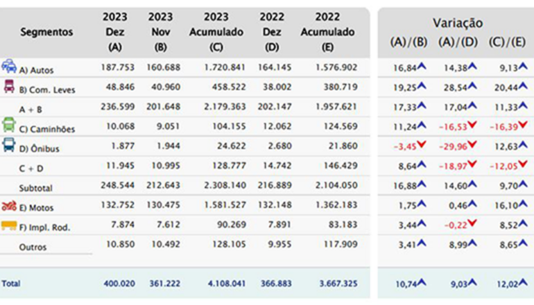 Com alta de 10,7% sobre o resultado de novembro, o mês de dezembro registrou 400.020 emplacamentos, fazendo com que o ano de 2023 fechasse com alta de 12% sobre 2022, segundo informações da FENABRAVE – Federação Nacional da Distribuição de Veículos Automotores. Todos os segmentos, à exceção de caminhões, registraram evolução no ano, com destaque para motocicletas (crescimento de 16,1%) e automóveis e comerciais leves (+11,3%).