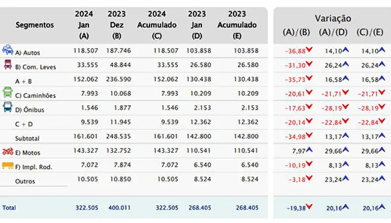 Já na comparação com o mês de dezembro, todo o setor sofreu quedas nos emplacamentos, à exceção de motos, que manteve movimento ascendente nas vendas. O Presidente da Fenabrave lembra que a queda nos volumes, em relação a dezembro de 2023, é justificada pela sazonalidade, que registra maior índice de emplacamentos e que o ano deve ser de crescimento para o setor. “Os primeiros meses do ano concentram algumas despesas que afetam a decisão de compra dos consumidores, como as aquisições de material escolar, pagamentos de IPVA, IPTU e matrículas escolares, entre outros gastos sazonais, mas acreditamos, conforme divulgado em nossa projeção, em um crescimento de 13,5% para este ano”, afirma.