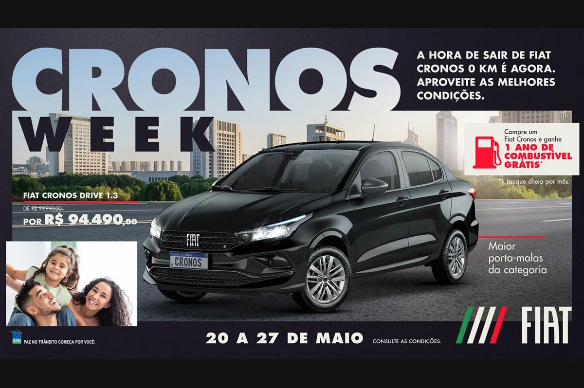 A Cronos Week traz descontos exclusivos como a versão Drive 1.3 MT, ofertada por R$94.490,00, uma redução de R$5.500, além de oferecer supervalorização do usado na troca. Para conferir todas as condições, basta ir até a concessionária Fiat mais próxima ou acessar o site: https://ofertas.fiat.com.br/.