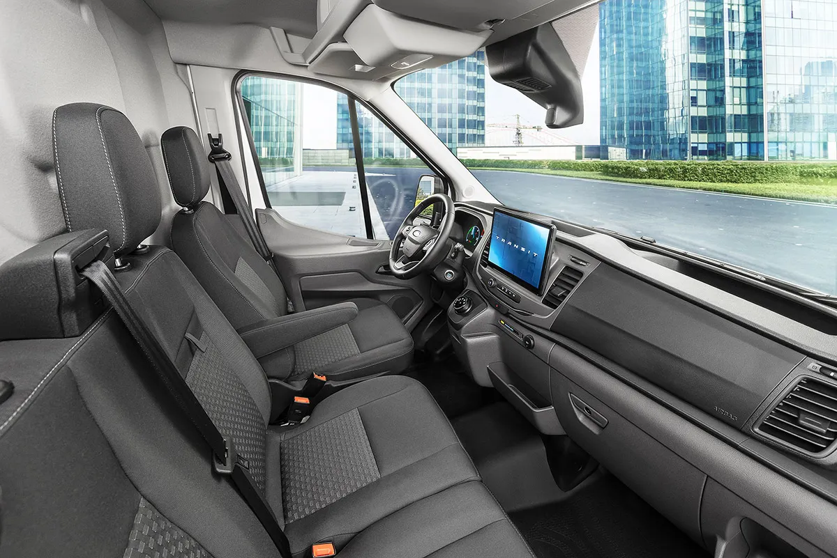 A E-Transit é disponível nas versões furgão e chassi-cabine para atender as diferentes demandas do cliente comercial. Ambas têm motor de 269 cv (198 kW) e torque de 43,8 kgfm, tração traseira e bateria de lítio com capacidade de 68 kWh, que garante autonomia de 317 km (padrão WLTP). O carregamento é feito com conector tipo 2, em 34 minutos com corrente contínua (115 kW) ou em 8 horas com corrente alternada (11,5 kW).