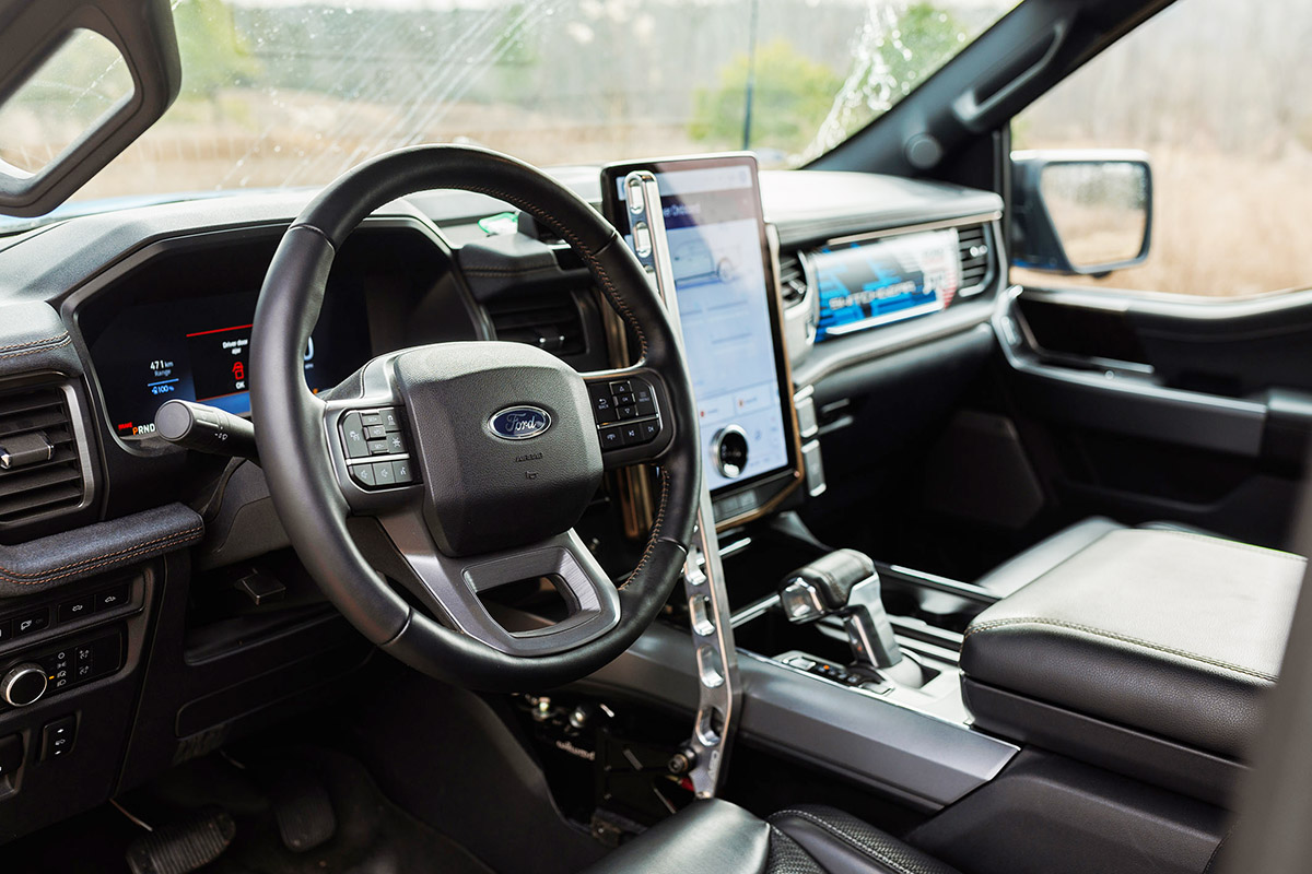 A bitola dianteira e traseira é de 80 polegadas, bem maior que a da F-150 Lightning normal, para a estabilidade off-road. Os para-choques também são exclusivos para aumentar os ângulos de ataque e saída.